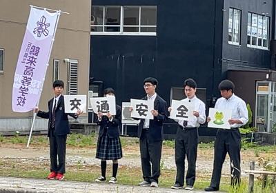 6月4日(火)の8時より、白山警察署鶴来庁舎前にて、3年生の就職希望者22名による、交通安全を促す挨拶運動が行われました。通勤途上のドライバーの皆様方に、「ながら運転はやめましょう」「横断歩道には特に気を付けて」「慣れた道でも注意しましょう」「譲り合いの優しい運転で」「家に帰るまでは気を抜かずに」などと、生徒ができるだけ大きな声で発声し、交通安全を呼びかけました。ドライバーの方より「おつかれさん」とご声援をいただいたり、激励のクラクションを鳴らしていただいたりして、生徒たちは嬉しそうでした。やがて自分たちがドライバーとなり通勤することから、交通安全の大切さを身をもって実感できたことでしょう。終了時には、鶴来庁舎所長の高畠様よりねぎらいのお言葉をいただきました。なお、本校の取り組みを評価していただき、鶴来地区交通安全協会様より功労団体として表彰していただくこととなりました。