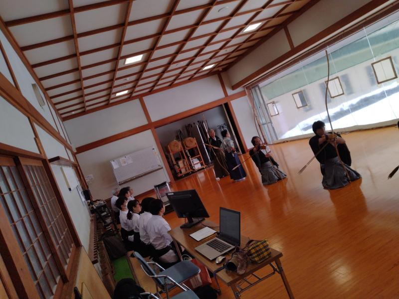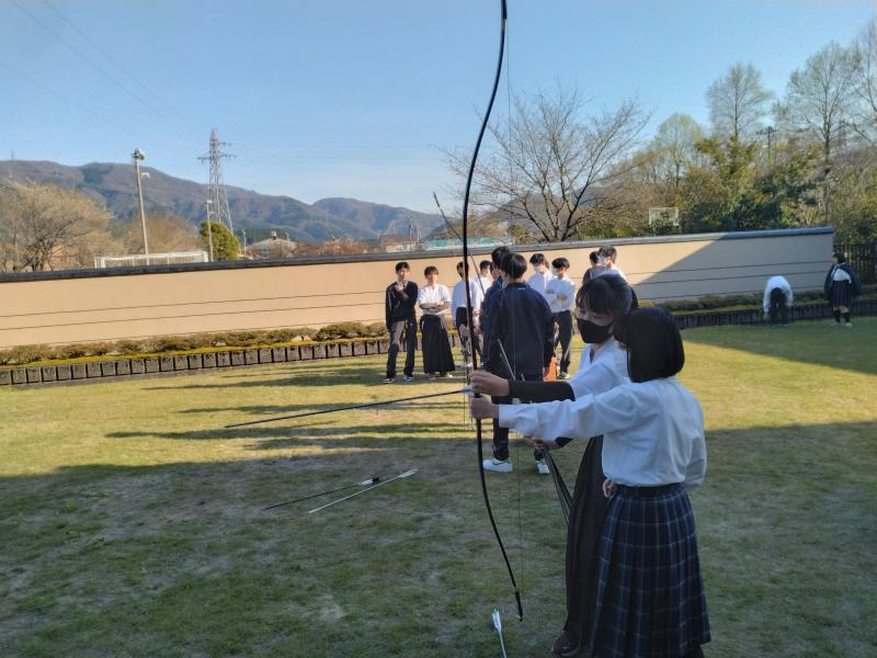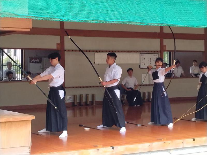県の弓道連盟の講師の先生方に2日間に渡って体配・射技を指導していただき、他校の選手と交流したことで、部長・副部長にとって良い経験となりました。