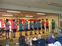 はじめに「津軽海峡冬景色」「なごり雪」「荒城の月」の3曲を披露した後、何人かの利用者の方にインタビューをしました。皆さんが「どの曲もよかった」と答えてくれて、部員たちもうれしそうでした。その後「涙そうそう」「カントリーロード」「君をのせて」を歌い、最後には利用者の方と一緒に「ふるさと」を歌いました。