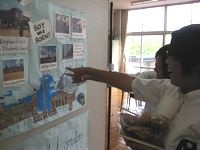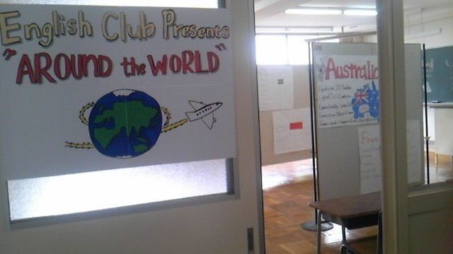 “Around the World”(世界一周)のテーマで展示をしました。夏休み中から部員全員で分担して書いたものです。アメリカ、フランス、イタリア、オーストラリア、ニュージーランド、中国、韓国、ブラジル、ベトナム、モナコの各国について調べたことを、一人1枚のポスターにして掲示しました。