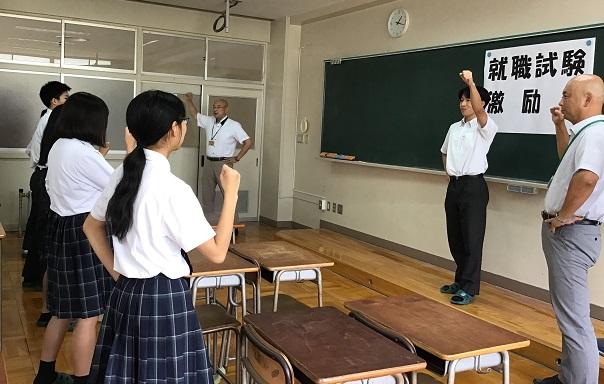 士気を高めるため「頑張ろう!三唱」を就職希望生と先生方で行いました(発声は元生徒会長の32H富樫旺二郎くん)。