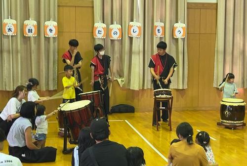 鶴来南児童館さんのお招きで、和太鼓演奏と「ちびっこ和太鼓体験」を行いました。児童館の周りでは、サッカー、野球、グランドゴルフ・・・と、スポーツの秋真っ最中の折、児童館ホールでは、かわいいお子様たちと保護者の皆様方10組ほどがつどい、和太鼓演奏会からの和太鼓体験です。音楽に合わせて一生懸命にバチを振りあげて太鼓に打ちつけるお子様たちのかわいいことかわいいこと・・・。あっという間に1時間が過ぎ、なごり惜しくも終了 となりました。ご参加いただいた皆様ありがとうございました。