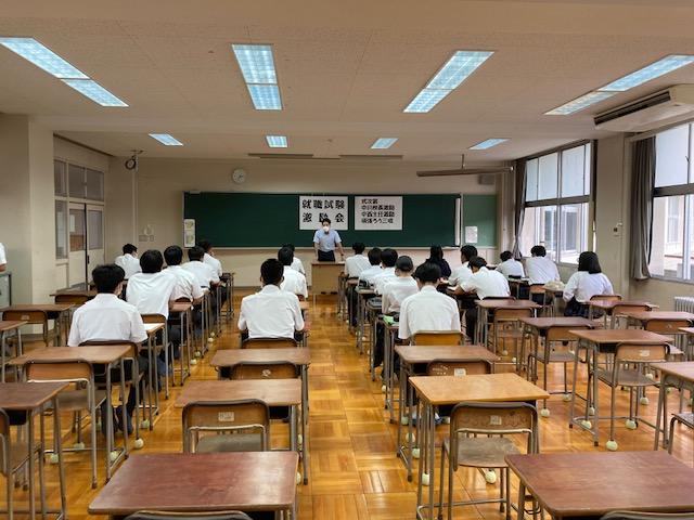 本日3年生の就職希望者を対象に就職模擬面接が行われました。本校職員の他に鶴来商工会「鶴来かがやき塾」の方々にも面接官をしていただき、より実践的な形で様々な指摘をしていただきました。面接を終えた生徒達に尋ねると「とても緊張したが、良い経験になった」と答えてくれました。かがやき塾の皆さん有り難うございました。