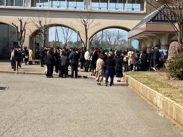 本日、卒業式が行われました。一人の欠席者もなく全員参加で、感激しました。卒業式終了後に、生徒を代表して、前期生徒会会長で柔道部でも主力として活躍した34Hの福田悠真君が、保護者に感謝を述べました。言葉1つ1つに心が込められておりとても感動しました。目頭を押さえる保護者の皆さんも多く見られ、すばらしい一時でした。今日は成長した3年生を見ることが出来、幸せな一日でした。生徒の皆さん、保護者の皆さん、職員のみなさん、有り難うございました。卒業式終了後も多くの生徒や保護者の皆さんが、学び舎からの別れを惜しんだり、写真撮影のために学校前に残っていました。