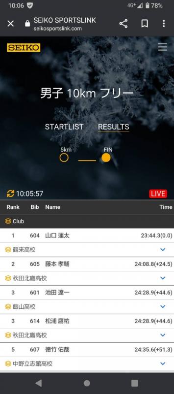 昨日フリーを制した山口連太君は本日のクラシカルでは、優勝は惜しくも逃したものの堂々の2位となりました。トップとは3秒差ということでした。