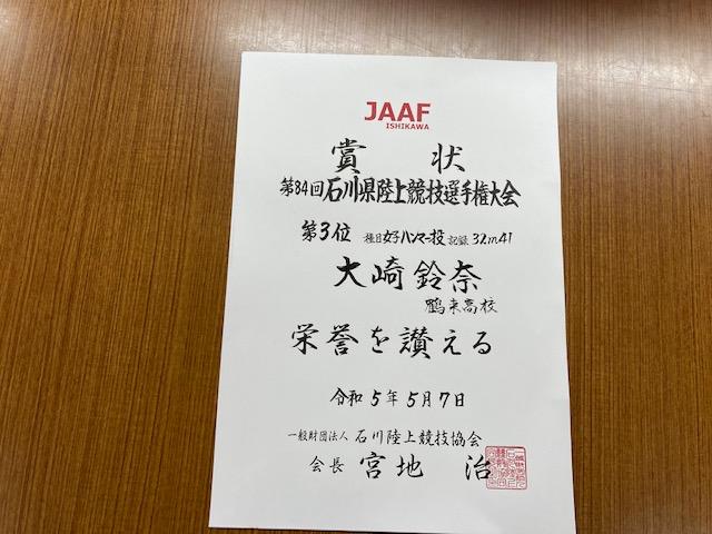 本校陸上部3年生の大崎玲奈さんが、7日開催されました石川県陸上競技選手権大会女子ハンマー投げで3位入賞を果たしました。次はインターハイ目指して頑張って欲しいです。