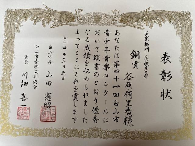 本校3年生で鶴来中学校出身の秋田ひなたさんが、金沢大学融合学域観光デザイン学類に見事合格しました。秋田さん本校では勉学はもちろん、部活動ではジャズバンド部の一員として大活躍しました。また地域探究会にも所属し、10月には全国ジオパーク手取川大会にも参加しました。鶴来高校は多くのことに挑戦しながら国公立大学やその他有名大学にも合格できます。中学生の皆さん、迷わず鶴来高校に来て下さい。
