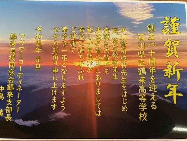 早速本校同窓会鶴来支部長の中島満先生より素晴らしい年賀状をいただきました。