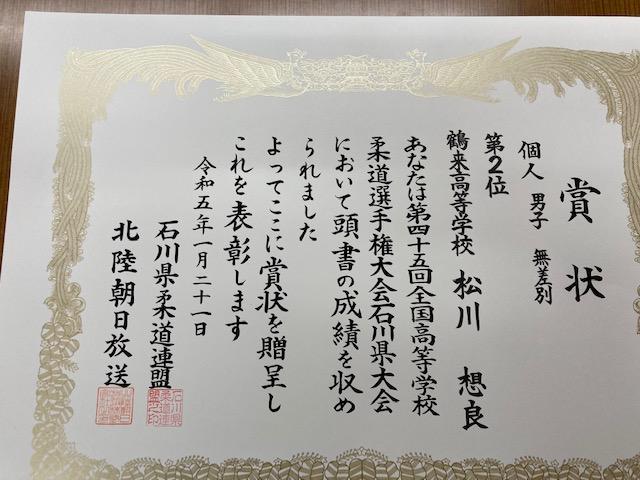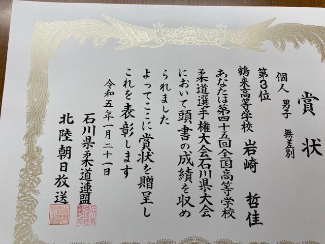 日曜日行われた石川県ジュニア柔道体重別選手権大会で本校柔道部の谷内さんが女子57kg級で見事優勝しました。また、男子でも松川君、岩崎君がそれぞれ3位に輝きました。総体が楽しみです。
