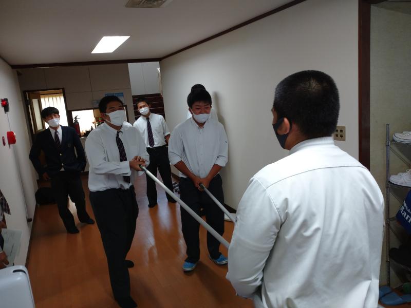 暖房器具を使い始めるこの時期に毎年行っています。寮のガスや電気の止め方を確認し、2階からの出火を想定して実際に避難しました。その後は防犯訓練として不審者への対応、さすまたの使い方を実践を交えながら確認しました。寮生たちはお互いに確認し合いながら真剣に訓練していました。