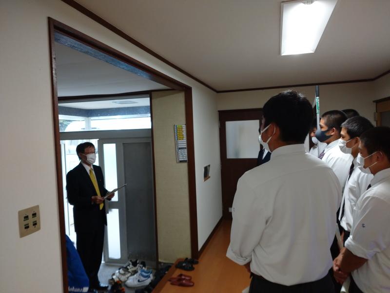 暖房器具を使い始めるこの時期に毎年行っています。寮のガスや電気の止め方を確認し、2階からの出火を想定して実際に避難しました。その後は防犯訓練として不審者への対応、さすまたの使い方を実践を交えながら確認しました。寮生たちはお互いに確認し合いながら真剣に訓練していました。