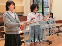 内容は音楽プログラムで、利用者の方と一緒に音楽に合わせて体操をしたり一緒に歌ったりしました。とはいえ、ほとんど知らない歌だったので、高校生は手拍子に徹していました。途中でジェスチャーゲームも行われ、高校生や職員の方が動物や職業などのお題を見て、お年寄りに何かを当ててもらっていました。最後に2学期に入ってから練習した「見上げてごらん夜の星を」と「ふるさと」をトーンチャイムで演奏しました。一緒に歌ってもらって楽しいひと時を過ごすことができました。