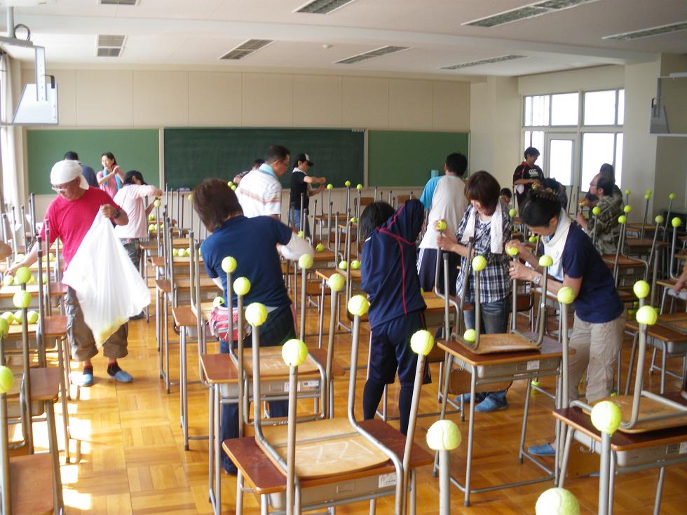 さらに、PTAの方々には教室のイスのあしにテニスボールの装着作業をしていただきました。