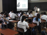 はじめに学校長より手取川歩行の目的についてのお話があり、その後、地域交流事業で白山ジオパークについて学習した21Hの生徒による、手取川キャニオンロードの見所についての説明がありました。次に理科担当の登内先生から危険生物などに関する諸注意があり、最後に橋場先生より昨年度の様子のスライドを流しながら、全体的な流れの説明がありました。