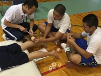 今日のスポ科は、各学年ごとにいろいろな取り組みがありました。1年生は鶴来消防署で救命講習会、2年生は本校体育館で金城大学医療健康学部理学療法学科の永井先生のゼミの方々による研修会、3年生は明和特別支援学校との交流学習でした。