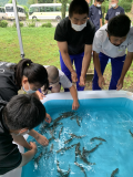 普段、スイッチ一つで出来る当たり前から外れ、文明の利器の有り難みを感じつつ炊いた白米をほおばり、いつも以上の旨味を感じていました。さらに、岩魚のつかみ取りから、内臓をさばき、串焼きにする取り組みを行いました。