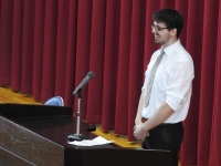 今日は8月末に開催される鶴翔祭の関係で、他校より1日早く1学期の終業式となりました。始めに各種部活動大会の上位入賞者や球技大会の表彰伝達式があり、合わせてALTのニック先生の離任式も行われました。ニック先生はたどたどしいながらも一生懸命勉強した日本語で生徒にお別れの挨拶をしてくれました。明日から長い長い夏休みに入りますが、規則正しい生活習慣を崩すことなく、勉強や部活と有意義に過ごしてほしいと思います。