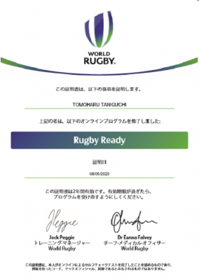 なお顧問3名は、ラグビーの国際競技連盟・ワールドラグビーの「新型コロナウィルス(COVID 19 )- コーチとプレーヤーのためのプレー再開に関する理解度テスト」を受講しました。