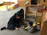 介護役の生徒は四苦八苦しながら要介護者役の生徒に衣服を着せていました。
