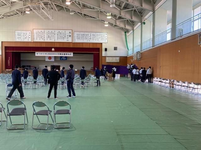本日、卒業式が行われました。一人の欠席者もなく全員参加で、感激しました。卒業式終了後に、生徒を代表して、前期生徒会会長で柔道部でも主力として活躍した34Hの福田悠真君が、保護者に感謝を述べました。言葉1つ1つに心が込められておりとても感動しました。目頭を押さえる保護者の皆さんも多く見られ、すばらしい一時でした。今日は成長した3年生を見ることが出来、幸せな一日でした。生徒の皆さん、保護者の皆さん、職員のみなさん、有り難うございました。卒業式終了後も多くの生徒や保護者の皆さんが、学び舎からの別れを惜しんだり、写真撮影のために学校前に残っていました。