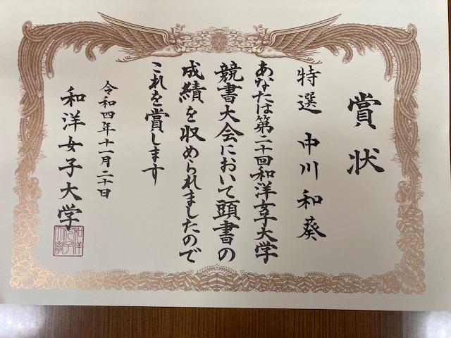 本校書道部の中川和葵が、和洋女子大学競書大会で特選に輝きました。また川幡君、中川拓斗君が金賞、中林さん、仁尾さんが銀賞、仁尾君、中山君銅賞に輝きました。