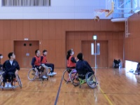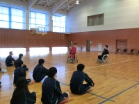 今日は白山市社会福祉協議会のご協力のもと、石川県の車椅子バスケットボールチーム「Jamaney石川」から北風大雅選手と岩崎大輔選手を招いて、車椅子バスケットボールを体験させていただきました。はじめに2人の選手によるデモンストレーションを見学し、生徒らは思った以上に激しい動きにびっくりしていました。その後の車椅子鬼ごっこでは、30秒で全員北風選手につかまってしまい、動きの素早さにも驚いていました。そして、半分に分かれてシュート練習やミニゲームを体験しましたが、みんなとても楽しんでやっていました。今日はお忙しい中、このような機会を設けてくださり、本当にありがとうございました。