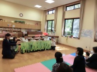 今年度2回目となる児童館実習へ行ってきました。はじめにきらきら星を振り付きで歌った後、ぶんぶんぶん、かたつむり、やぎさんゆうびん、犬のおまわりさんを歌いながら踊ったりペープサートをしたりしました。今回は伴奏もすべて生徒で担当し、細かいミスはありながらも曲が止まることはなく、すべてやりきることができました。また、最後にトーンチャイムでおもちゃのチャチャチャとさんぽを歌いながら演奏しました。お客さんは保護者と子ども3組計7人で、子どもも小さかったですが、一緒に楽しんで歌ったり踊ったりしてくれて、生徒も喜んでいました。