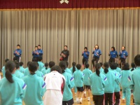 1年生180名を前に堂々とした動きを見せ、音楽に合わせて体幹トレーニングフィットネスを行いました。