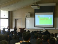パワーポイントや動画を活用しながら、生徒の意見を交えて話を進めていました。
