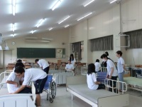 今日は金沢南ケアセンターから中島さんをお招きしての介護技術の授業が行われました。テーマは車椅子からベットへの「移乗介助」です。先月に学習した車椅子の使い方を復習しながら、利用者が半身マヒと全マヒの場合をそれぞれ実技指導していただきました。見ていると簡単そうに見えるのですが、実際にやってみると生徒たちは思ったより大変だということを実感していました。