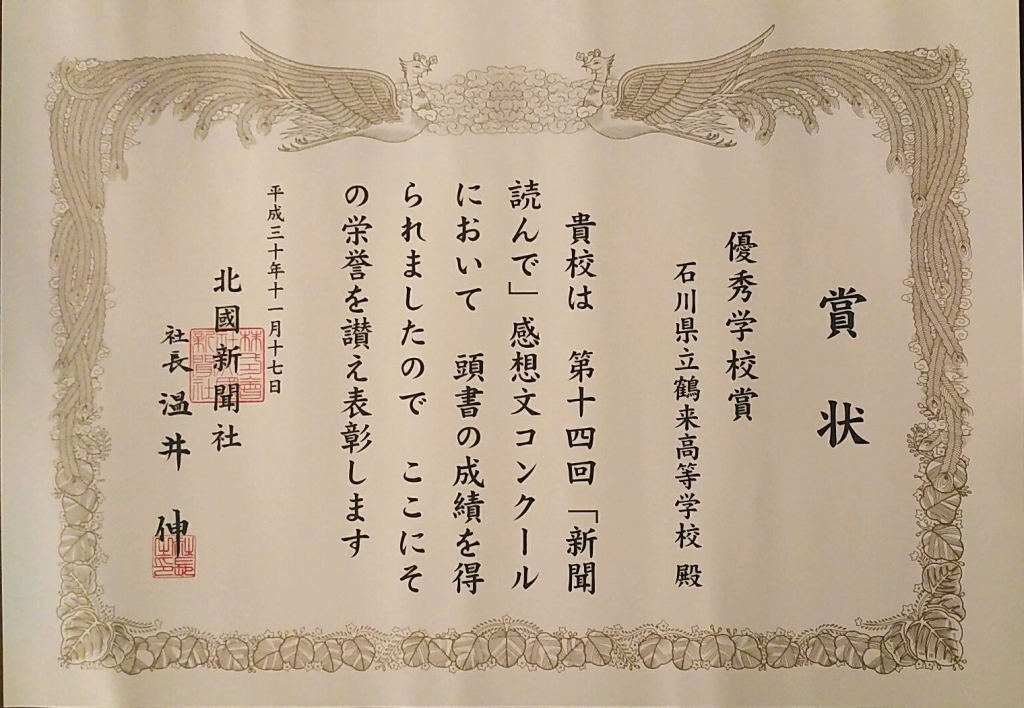 11月17日(土)午前11時より、北國新聞会館で北國新聞社主催の「新聞読んで」感想文コンクールの表彰式が行われました。鶴来高校はおかげさまで優秀学校賞をいただくことができました。生徒たちには新聞を読み、自ら考えることで、社会や地域に関心を持ってもらいたいと願っています。
