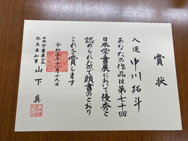 書道部の生徒が日本学書展で入選を果たし、奈良県知事から表彰されました。