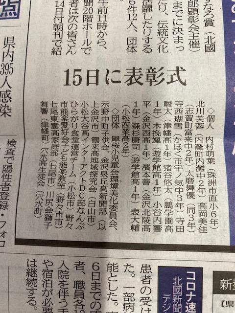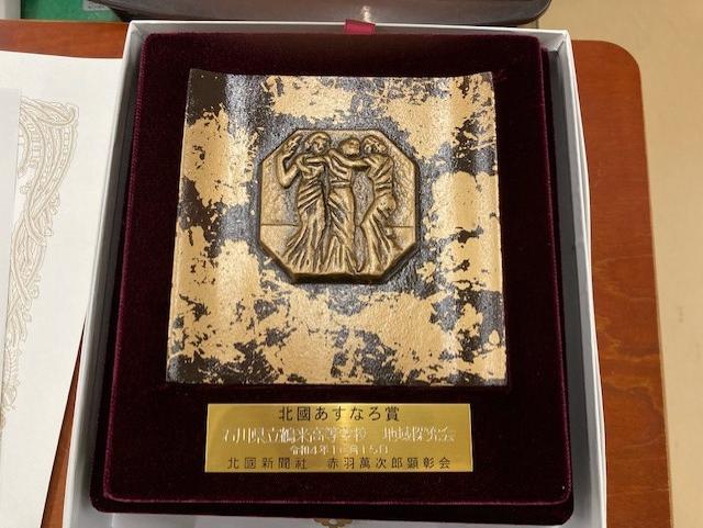 本校地域探究会が北國新聞のあすなろ賞に輝きました。日頃からの地域交流が認められました。部員達は10月21日からの第12回日本ジオパーク全国大会白山手取川大会に向けて更に活動を広げていきます。