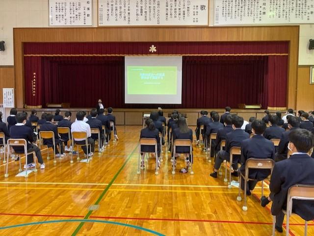 本日2年生の総合的な探究の時間に、農事組合法人北辰農産代表理事 舘喜洋氏 株式会社建築昌英代表取締役社長 松村 昌英氏をお招きして就職講話を実施しました。舘さんからは失敗を次に生かすことの大切さ、松村さんからは目標・目的を持つことの大切さを学びました。すばらしいお話で、私も勉強になりました。
