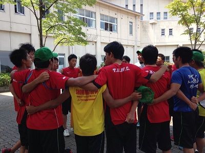 (清掃後、マネージャー特製のしそおにぎりを食べる部員たち)