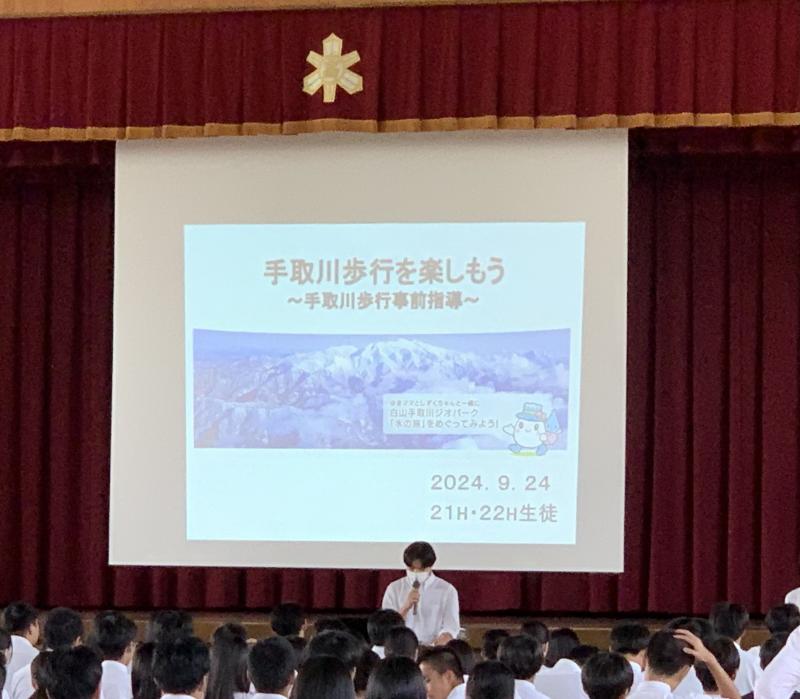 本日はそれに先立ち、手取川ジオパークを探究で学んでいる2年生の生徒の皆さんからコースの見どころを、担当教員から注意事項をお話させてもらいました。