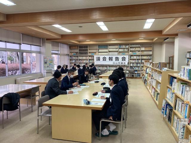 本日、白山市議会議員の方々7名が本校を訪れ、議会報告会が行われました。質問コーナーでは議員の給料等の質問もあり、最初は緊張した様子でしたが、少しずつリラックスした感じで、和やかな雰囲気で会が進行しました。白山市議の皆さん有り難うございました。