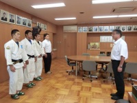 インターハイ激励費授与式 投稿日時 : 2018/08/07 特活 カテゴリ:生徒会行事 今日は明日からインターハイに出発する柔道部の3人に、校長室にて激励費が授与されました。校長先生からそれぞれに目標に向かって身体に気を付けて精いっぱい頑張ってきてほしいとの激励の言葉をいただいたあと、主将の若狭選手に激励費が手渡され、それぞれ一人ずつ抱負を述べました。全国制覇を成し遂げる、目の前の一戦一戦に集中して戦うなど、気迫のこもった抱負ばかりでした。健闘を祈ります!!