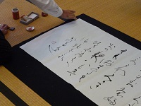 この後,和室移動し顧問による仮名書の揮毫を観てもらいました。