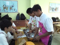 2日目の午前中は「沖縄体験ニライカナイ」という場所で、ムーチーという沖縄のお菓子やパインジャムを作っています。生徒たちは楽しそうに、かつ真剣に沖縄の文化に触れています。午後からはマリンスポーツを体験する予定です。