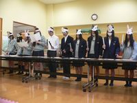 生徒たちは動物になって乳幼児とその保護者に向けて「おきゃくさま」「あくしゅでこんにちは」の2曲を歌い、トーンチャイムというハンドベルに似た楽器で「山の音楽家」「崖の上のポニョ」の2曲を演奏しました。