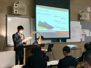 本日午後からスポーツ科学コース3年生の卒業研究発表会が開催されました。1.2年時にスポーツ概論の授業で疑問を持ったことや興味のある分野から研究テーマを決め、3年間を通して学んだ知識をベースに実験やアンケート調査を行い、発表しました。本日の全体発表会では、スポーツ科学コース3年生の中から選抜された6つのテーマについて発表しました。