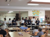 第2回目となる施設実習に行ってきました。今回ははじめに身体の体操や頭の体操(〇✕クイズ)を施設の利用者の方と一緒に参加して楽しんだ後、最後にトーンチャイムの演奏で「ふるさと」と「見上げてごらん夜の星を」を歌いながら演奏しました。どちらもお年寄りに馴染みある歌なので、たくさんの方が一緒に歌ってくれました。