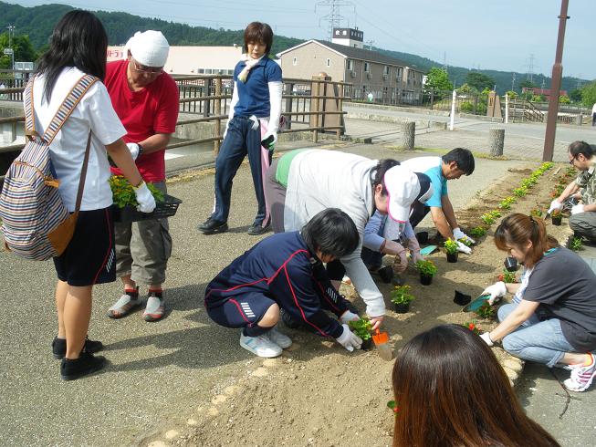 暑すぎず、作業しやすい気温のおかげでスムーズに植えることができ、あっという間に川沿いが華やかになりました。