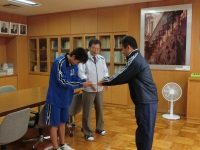 本日昼休みに、今週末北信越新人大会に出場する陸上部の安井選手が、校長先生から激励費を授与されました。安井選手は高校に入ってから急速に成長し、先日の県新人大会で2位に入賞するほどの実力をつけてきています。激励費をもらった後は、安井選手から「3位以内に入賞できるように全力を尽くしてきます」と力強いお礼の言葉がありました。