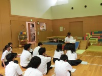 今日は「社会福祉基礎」1学期最後の授業でした。その授業に、金城大学子ども福祉学科から岡部先生を招いて、保育士・幼稚園教諭の仕事というお題で講義していただきました。岡部先生自身が、大学に来る前は保育園、幼稚園ともにお勤めの経験があり、現場でのお話を交えながら、ただ子どものお世話をするだけではなく、愛情を注ぐことの大切さを教えてくださいました。