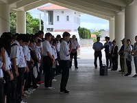 お昼にはタコライスと沖縄そばを食べ、民泊体験が行われる伊江島に出航しました。伊江港では受け入れ民家の方々からお出迎えを受け、入村式が行われました。生徒の中には緊張した表情の生徒もいましたが、それぞれが1泊の生活を楽しむなかで、大きく成長してくれることを願っています。