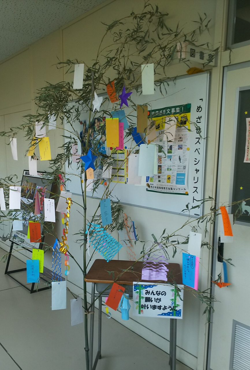 7月も段々と近づいてきました。本校1階図書室前に生徒や教員の書いた短冊や飾りをつけた笹が置かれています。進路や部活動での希望の実現など様々な願いが書かれています。生徒達の希望を実現すべく学校としても色々な形で応援したいと思っています。