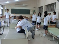 今日は金沢南ケアセンターから中島さんをお招きしての介護技術の授業が行われました。テーマは車椅子からベットへの「移乗介助」です。先月に学習した車椅子の使い方を復習しながら、利用者が半身マヒと全マヒの場合をそれぞれ実技指導していただきました。見ていると簡単そうに見えるのですが、実際にやってみると生徒たちは思ったより大変だということを実感していました。