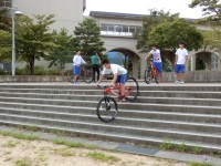 3年スポ科のスポーツⅤの授業において、マウンテンバイク実習を行いました。第1回目は、バイクの構造を理解するために分解して掃除を行ったあと、学校周辺をサイクリングしたり、傾斜や階段を使って走行の練習をしました。生徒たちはいつもとは違ったバイクの扱いに最初は戸惑っていましたが、すぐに慣れ、楽しんで活動していました。